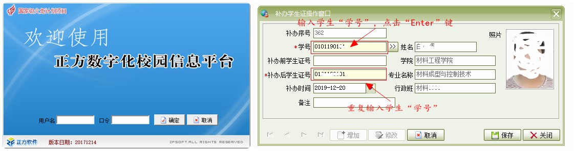 【操作步骤】学生管理1→学生证处理2→补办学生证3→点击右键“增加”4→在“补办学生证操作窗口”5输入“学号”回车6,填写“补办后学生证号”7(输入学号),点击“保存”8即可。
