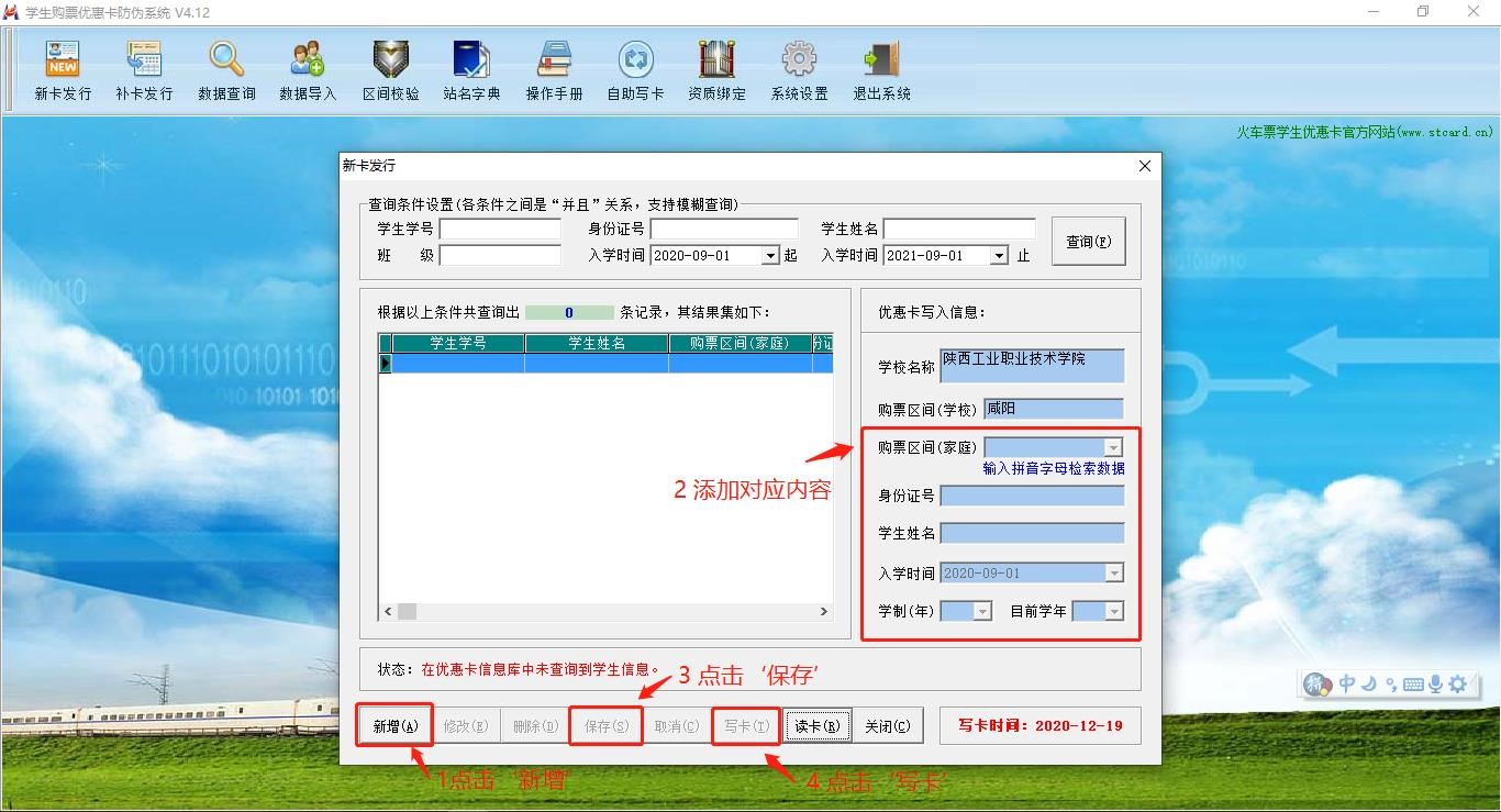 ⑴学生在使用过程中如发现学生购票优惠卡写入的“实名制”数据与本人信息不符,应及时向所属二级学院学生工作办公室反映,由辅导员负责使用学生证购票防伪识别器在学生购票优惠卡防伪系统中进行变更(详见下图)。
