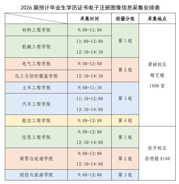 各院系具体采集时间段见下表,请各二级学院根据采集时间提前安排好班级拍摄顺序并于5月7日前将电子版报教务科,采集当天要求以班为单位按学号顺序依次进入拍摄场地。