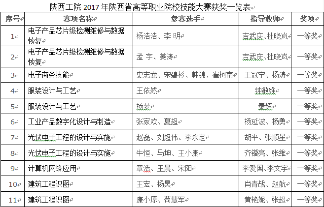 近日,陕西省教育厅公布了2017年高等职业院校技能大赛成绩,我院大赛成绩遥遥领先,共获得一等奖21项、二等奖25项、三等奖17项,一等奖占全省19.3%,位居全省高职院校首位,同时我院被省教育厅评为优秀组织单位。