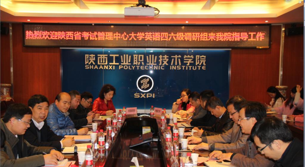 会上,杨卫军副院长对调研组一行表达了热烈的欢迎,并对学院的基本情况和历史发展做了详细介绍。教务处赵明威副处长从监考队伍及建设、应急体系建设、考试安全三个方面就我院大学四六级考试工作向调研组进行了细致汇报。陕西中医药大学、西藏民族大学、咸阳师范学院、陕西国际商贸学院、陕西服装工程学院5所兄弟院校针对大学四六级考试工作分别进行了汇报。听取汇报之后,省考试管理中心大学英语四六级工作王敏主管代表调研组对我院考试组织工作给予充分肯定,并对我院细致的考试组织流程进行了表扬。工作汇报之后,调研组就如何更好地开展大学英语四六级考试工作同与会者进行了热烈的讨论,同时针对即将颁布的2015年12月份大学四六级考试文件进行了深入研讨。