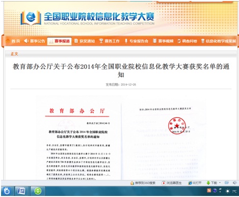 2014年全国职业院校信息化教学大赛于2014年11月1日-3日在南京举办,来自各省、自治区、直辖市,计划单列市以及新疆生产建设兵团的726件参赛作品参加了中职组信息化教学设计、信息化课堂教学、信息化实训教学和高职组信息化教学设计、信息化课堂教学、网络课程等6个项目的比赛。