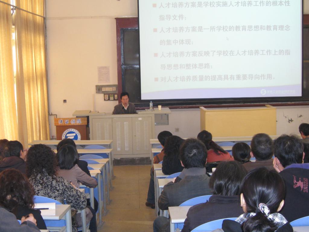 王津教授首先介绍了制定人才培养方案的依据、模式、程序、结论;随后重点阐述了专业人才培养方案基本框架设计的五个原则。他指出人才培养方案基本框架设计的总体设计原则要有利于人才培养目标的实现、有利于提高专业建设质量、有利于提高教学管理效率。他结合《陕西工业职业学院关于制定人才培养方案的原则意见》深入讲解了“公共选修学习领域”、“专业一般学习领域”、“专业拓展学习领域课程”等课程体系结构以及学院开展第一课堂、第二课堂、第三课堂渗透素质教育与专业教育结合的课程设置模式。