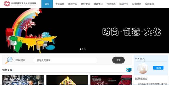 纺织品设计专业教学资源库,基于纺织品创新设计驱动,围绕时尚创意纺织品、技术创新纺织品、民族技艺纺织品,构建校际、校企和国际化的协同创新机制,实现行业、企业、国内院校和海外纺织品设计的特色资源整合和集成,推动纺织品设计专业教学改革,提高学生的创新、创业能力,满足企业设计人员培训、社会自主学习的需求,推广民族纺织文化和传统纺织技艺,使民族纺织文化和技艺与纺织新技术、新产品相互融合。