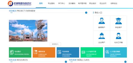 “职业教育机械制造与自动化专业教学资源库”是2016年7月正式获批立项陕西省高等职业教育专业教学资源库建设项目(陕教高办〔2016〕30号,项目编号:GZ-1603)。建设有专业教学、职业培训与社会服务、专业拓展三大类资源,包括专业建设园地、学习中心、校企合作、创新创业、实训基地中心、职业培训、图书馆等共七个子库资源。涵盖机械设计与制造专业,辐射精密机械技术、机电设备维修与管理等三大专业群。采用数字化虚拟现实技术,开发优质教学资源;建成了10门专业主干课程、搭建了20门个性化学习课程、制作微课200个以上、资源库素材总量达10000条以上。通过现代信息技术、网络技术,实现"能学、辅教"即导学、导做、辅教、助训、可评等五大功能,优质教学资源共建共享。是集资源检索、信息查询、资料下载、专业教与学、企业员工技能提升、就业创业者培训和教育等功能于一体的数字化、开放式、共享性、专业学习与服务平台,为职业院校教师教学、企业职工培训、学生和社会学习者自主学习服务。